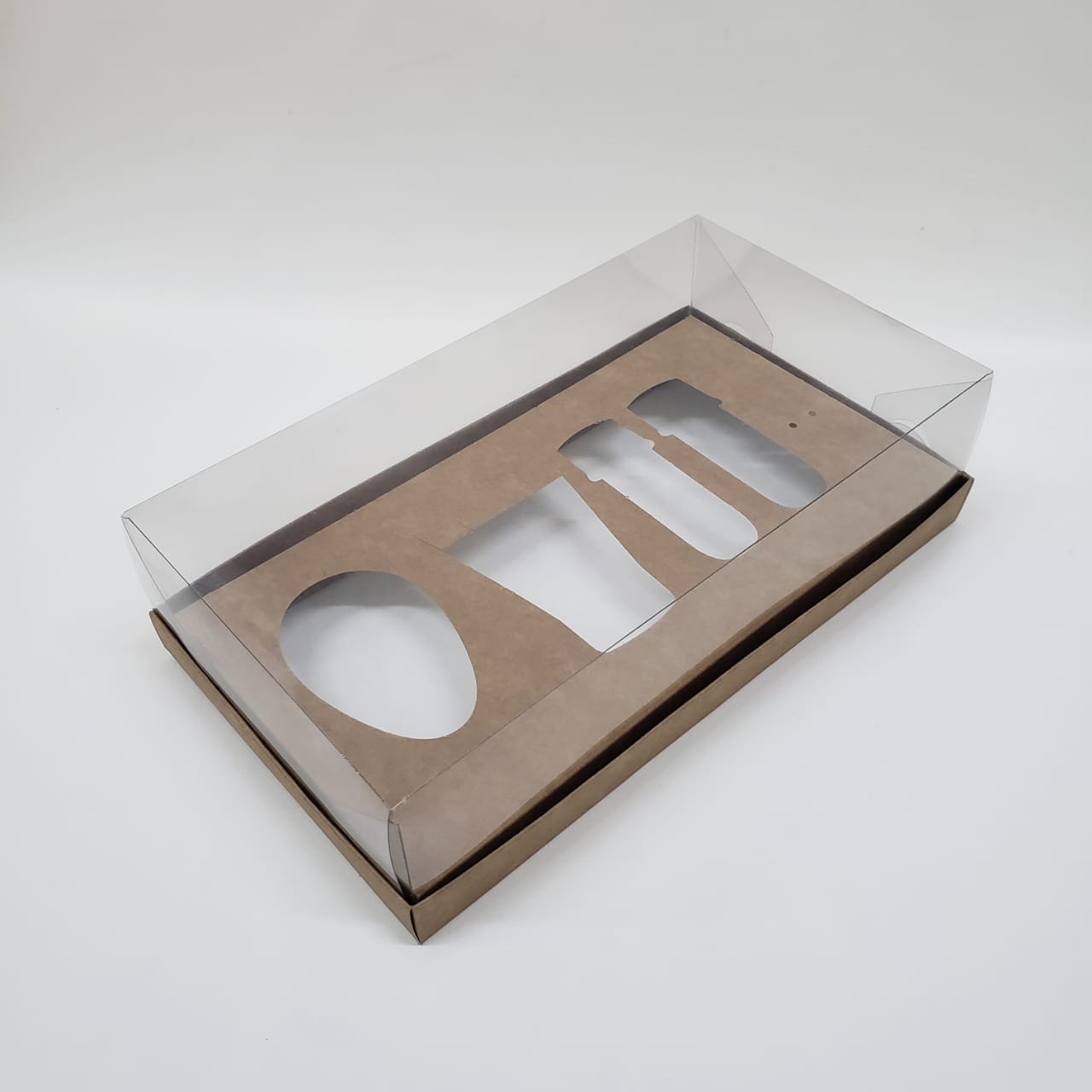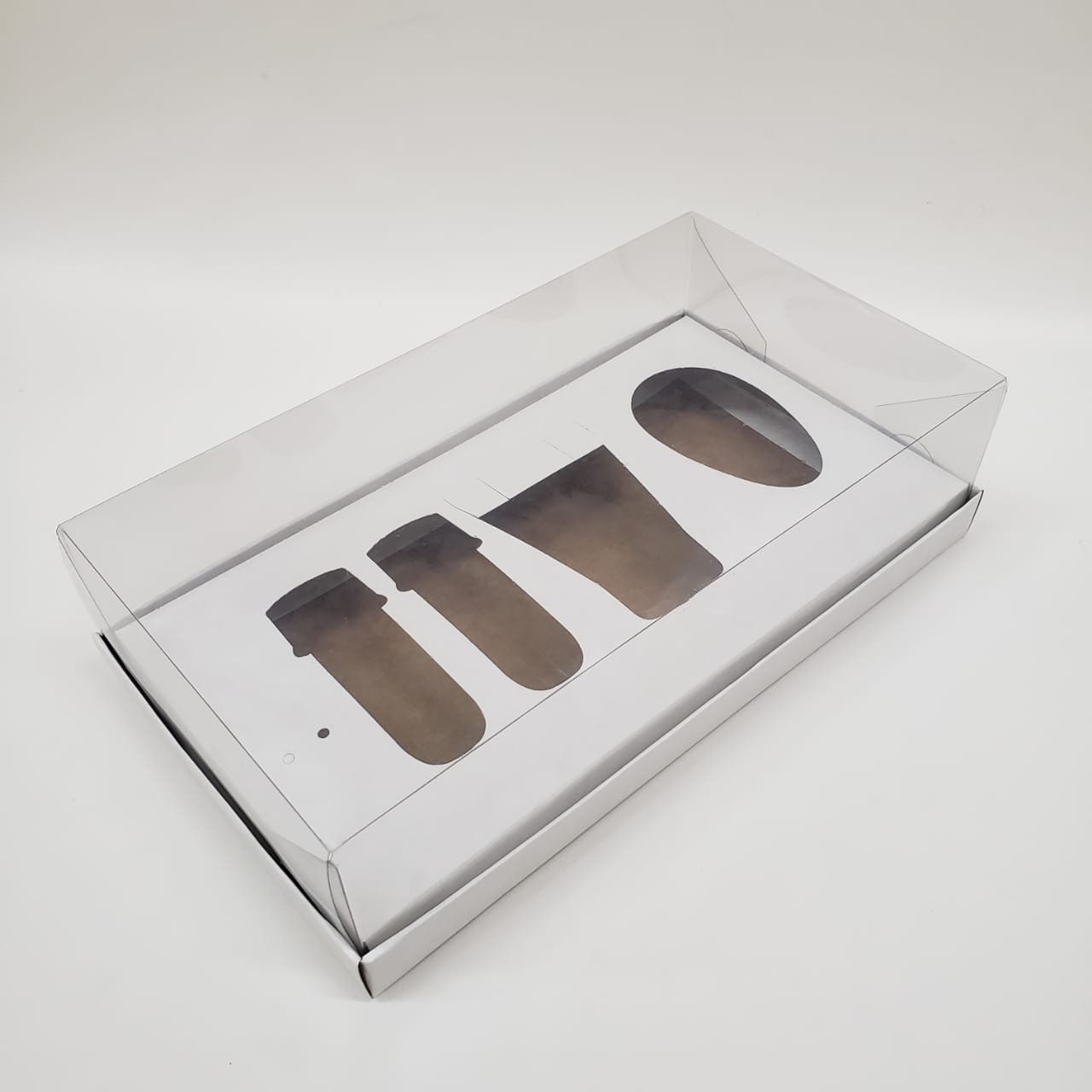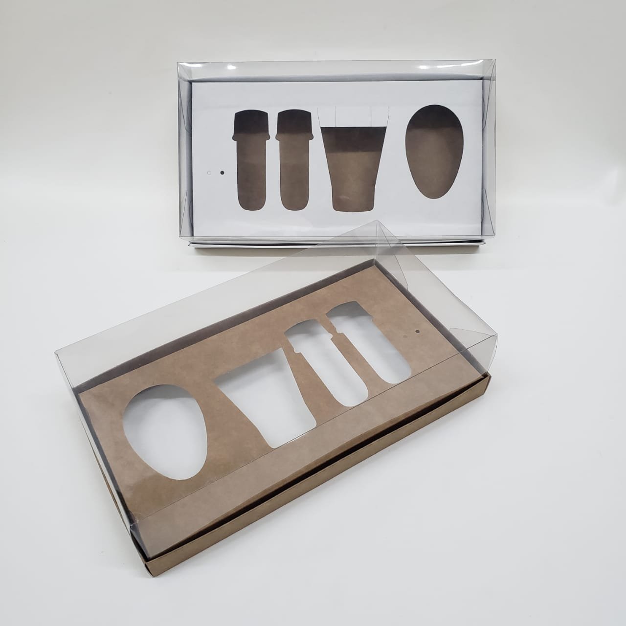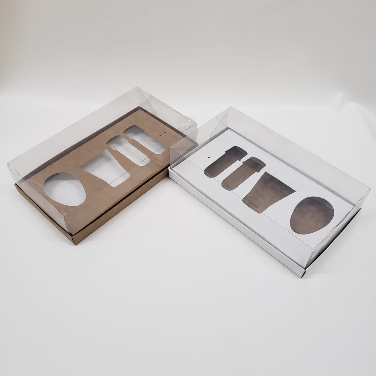Caixa de papel dupla face, um lado na cor branca e outro lado kraft, com tampa transparente. Pode ser montada tanto na cor branca quanto na cor kraft.