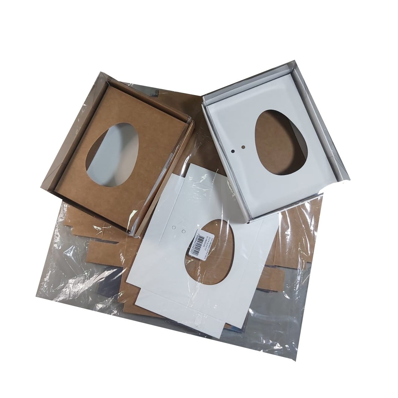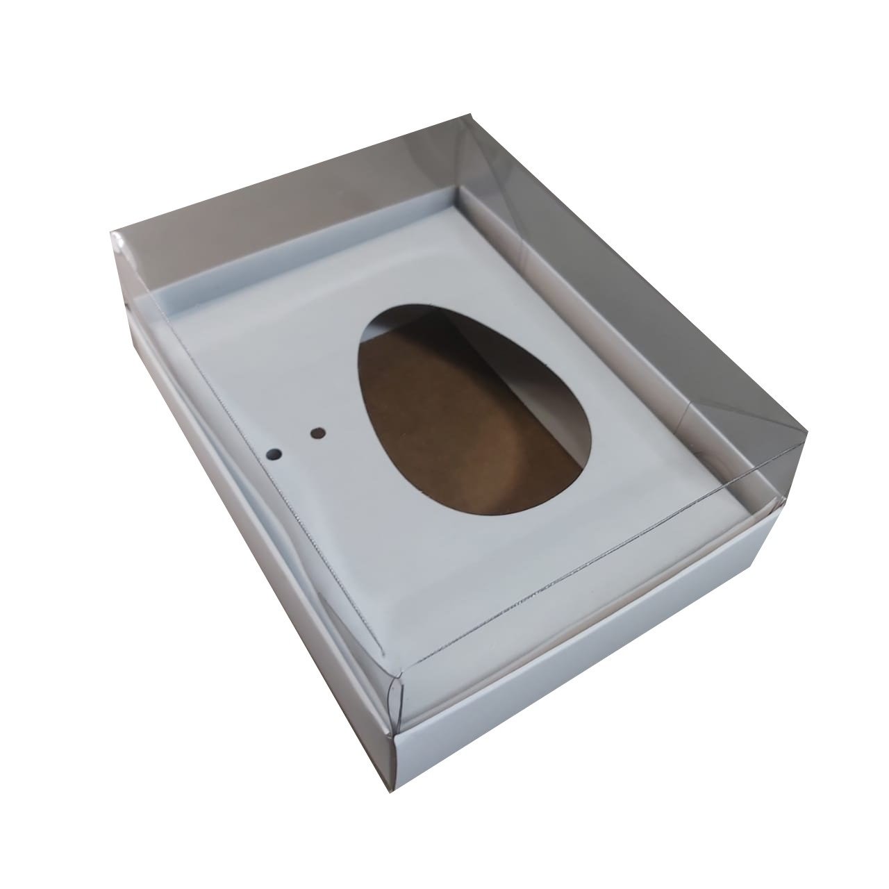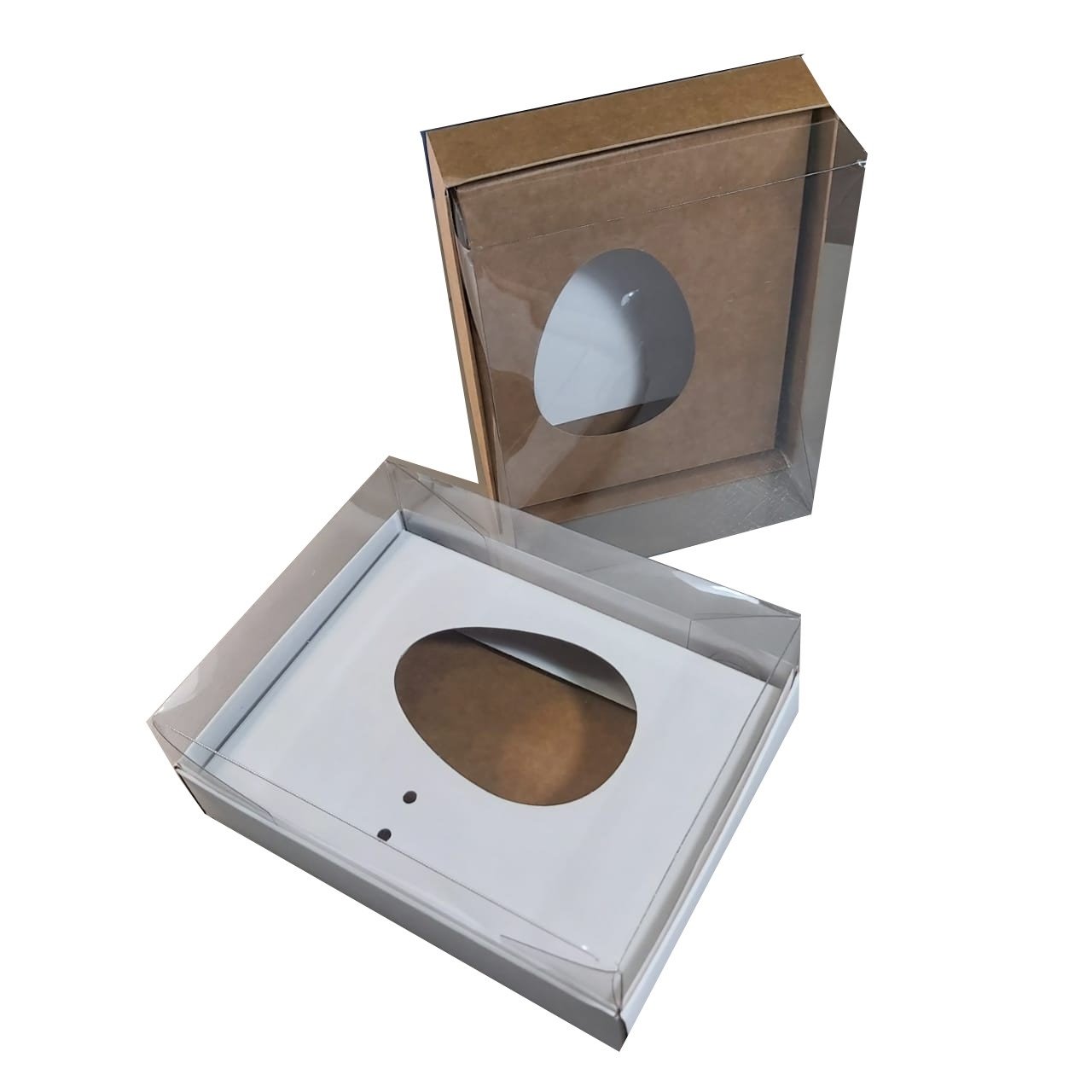 Caixa de papel dupla face, um lado na cor branca e outro lado kraft, com tampa transparente. Pode ser montada na cor branca quanto na cor kraft.