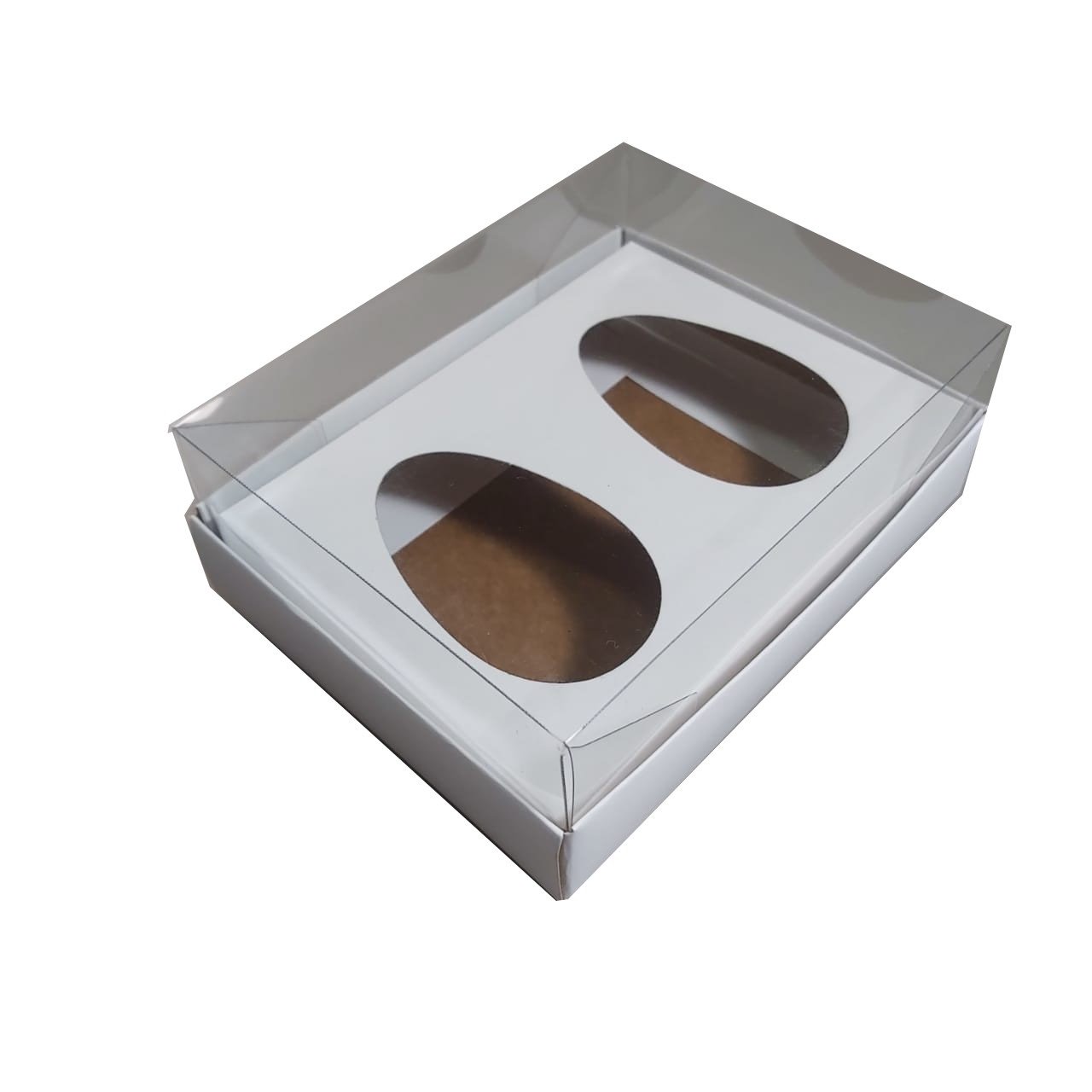 Caixa de papel dupla face, um lado na cor branca e outro lado kraft, com tampa transparente. Pode ser montada na cor branca quanto na cor kraft.