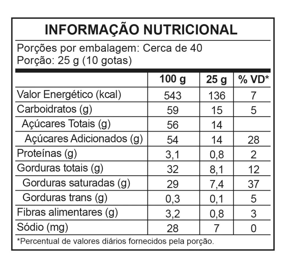 Ingredientes: Açúcar, gordura vegetal fracionada, cacau em pó, leite integral em pó, líquor de cacau, soro de leite em pó, sal, emulsificantes INS-322 (Lecitina de Soja) e INS-476 (Polirricinoleato de Poliglicerol) e aromatizantes. CONTÉM LACTOSE. NÃO CONTÉM GLÚTEN. ALÉRGICOS: CONTÉM DERIVADOS DE LEITE E SOJA. PODE CONTER OVO.