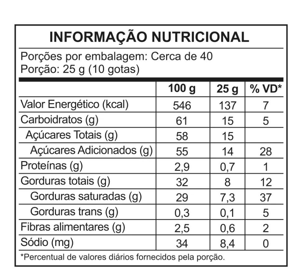 Ingredientes: Açúcar, gordura vegetal fracionada, cacau em pó, leite integral em pó, líquor de cacau, soro de leite em pó, emulsificantes INS-322 (Lecitina de Soja) e INS-476 (Polirricinoleato de Poliglicerol) e aromatizantes. CONTÉM LACTOSE. NÃO CONTÉM GLÚTEN. ALÉRGICOS: CONTÉM DERIVADOS DE LEITE E SOJA. PODE CONTER OVO.