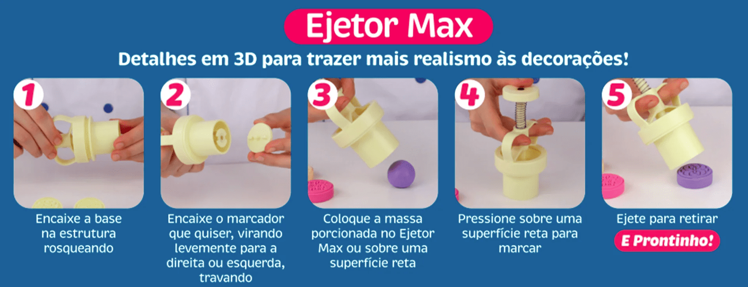 Modo de usar: Encaixe a base na estrutura rosqueando. Em seguida, encaixe o marcador escolhido virando levemente para os lados, para travar. Coloque a massa a ser utilizada no ejetor e pressione sobre uma superfície reta para marcar. Ejete para retirar e veja sua linda produção!