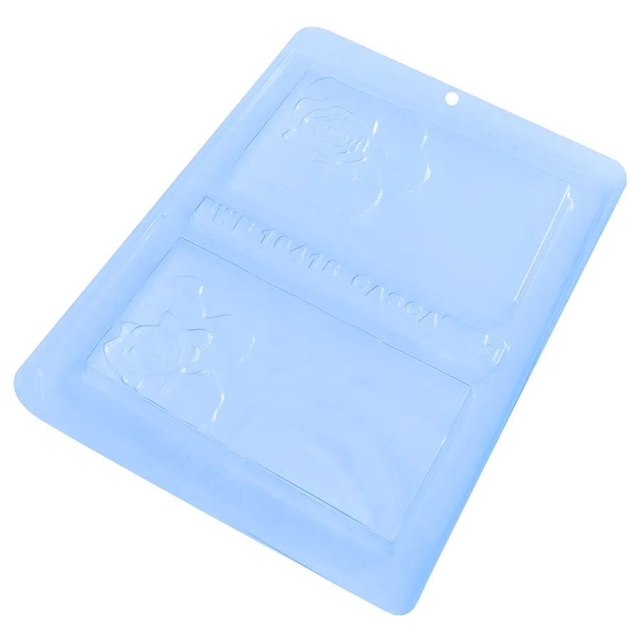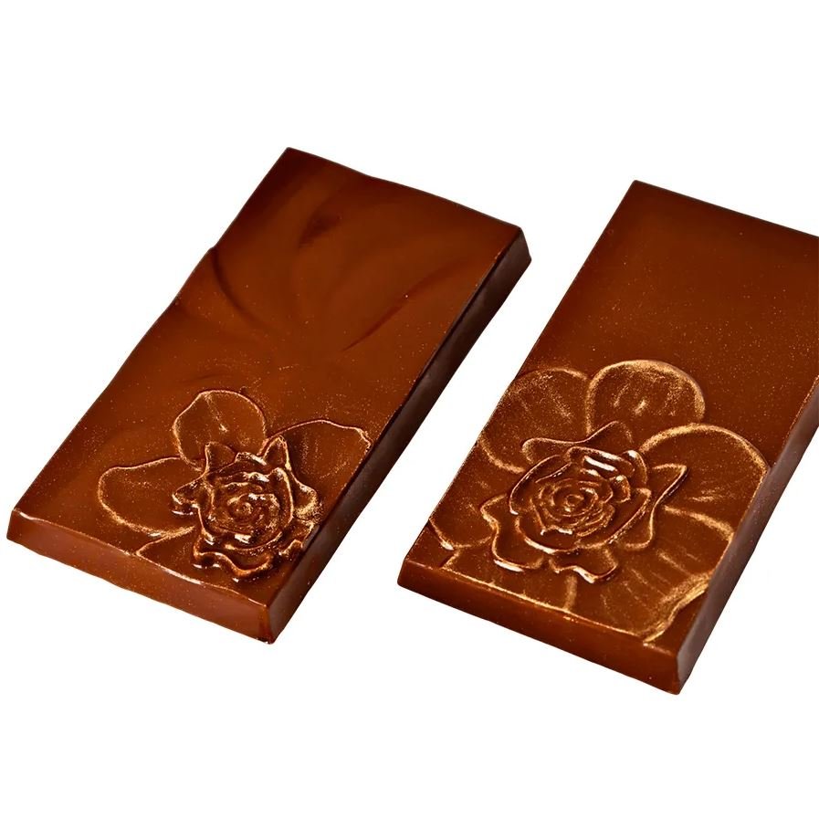 Forma em acetato com silicone (3 partes), sendo 2 partes rígidas de acetato e 1 flexível de silicone (o silicone vem com a quantidade de acordo com o número de cavidades). Ideal para confecção de bombons de chocolate.
