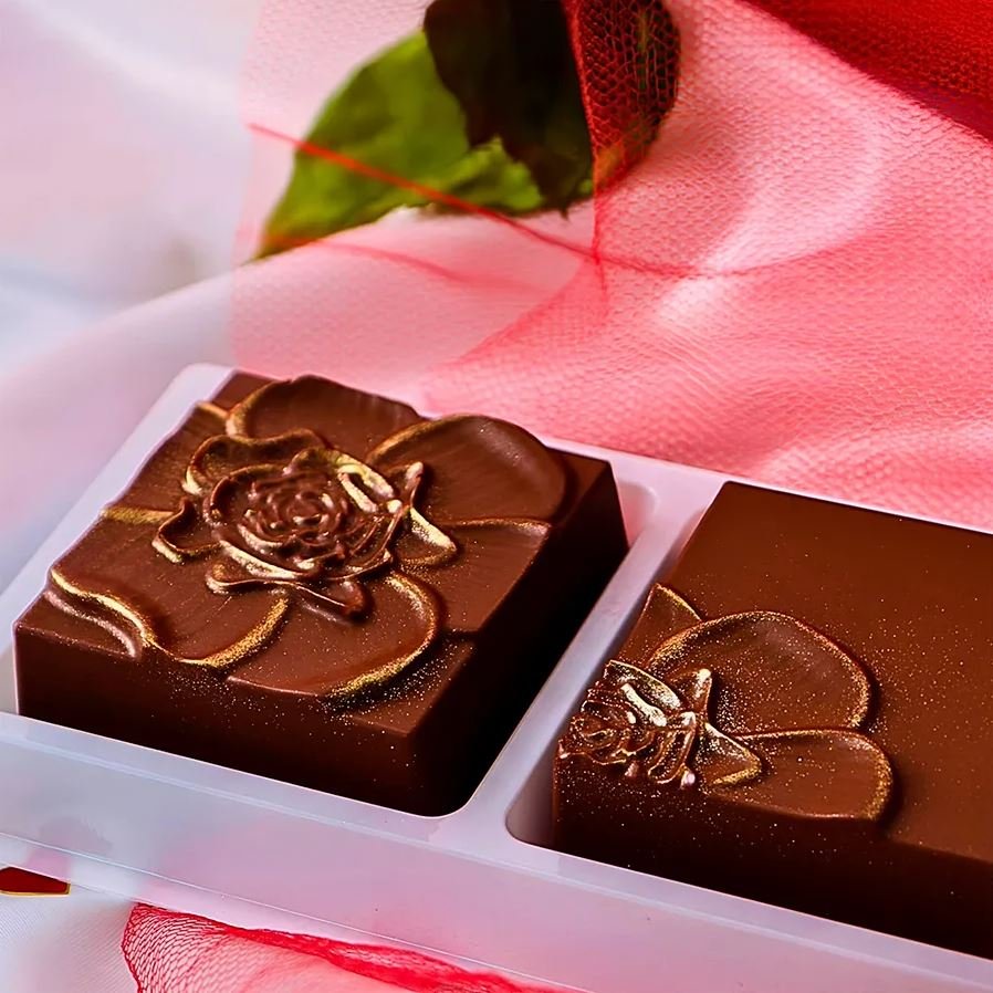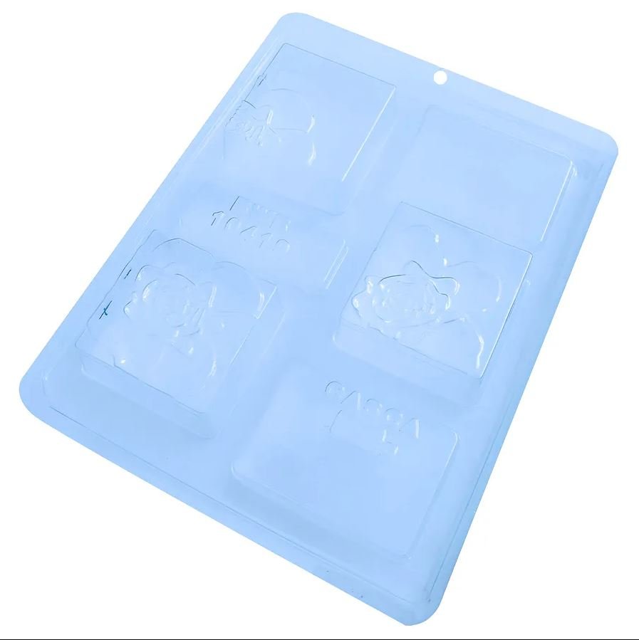 Forma em acetato com silicone (3 partes), sendo 2 partes rígidas de acetato e 1 flexível de silicone (o silicone vem com a quantidade de acordo com o número de cavidades). Ideal para confecção de bombons de chocolate.