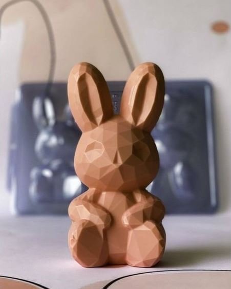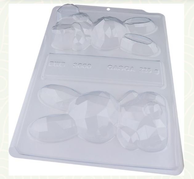 Forma em acetato semiprofissional com silicone para confecção Coelho de Páscoa lapidado. Possibilita o formato 3D do produto final.