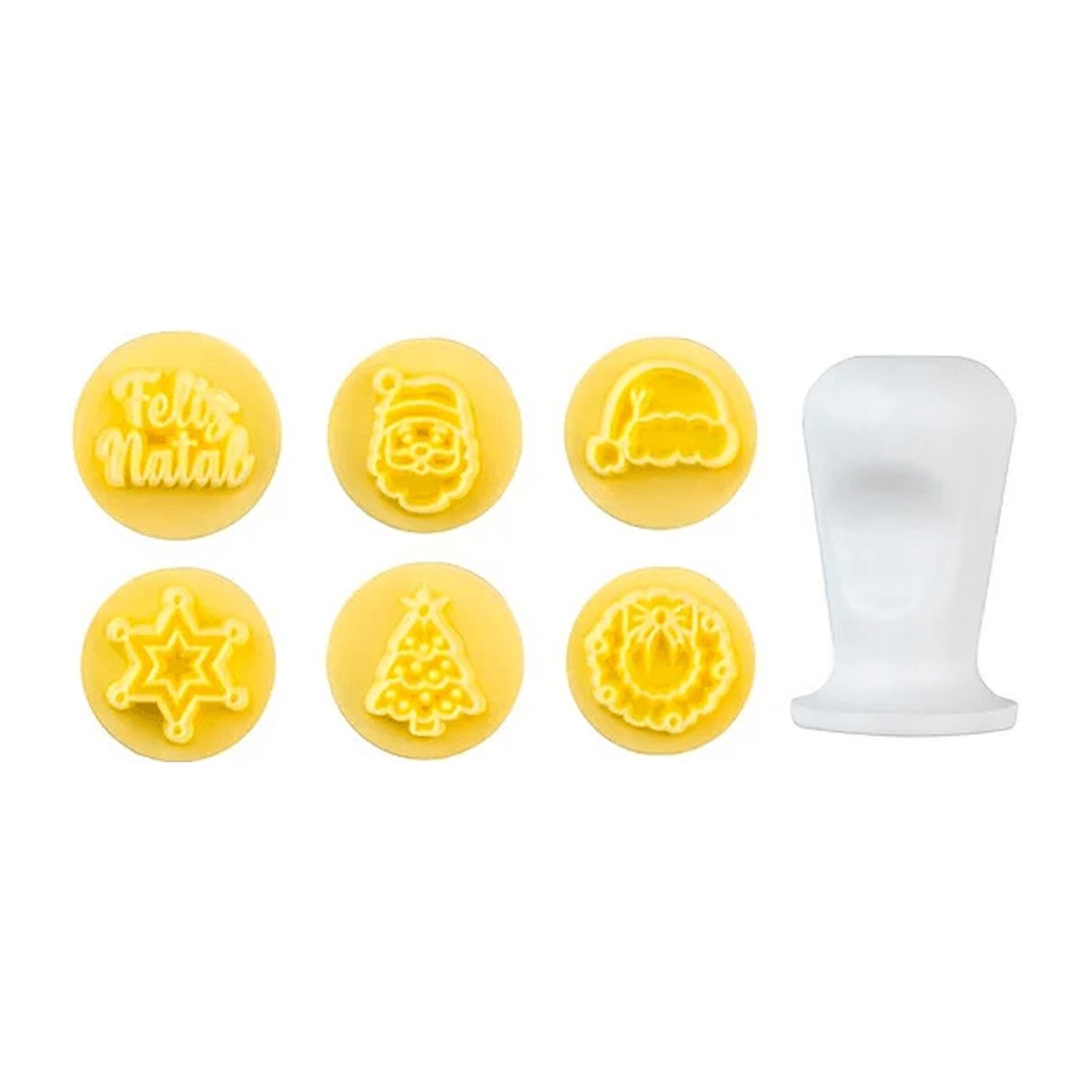 Kit Carimbos de Natal iluminado amarelo é ideal para você dar um toque todo especial e personalizado às suas produções, de forma prática e rápida! Ideal para carimbar docinhos como brigadeiro, beijinho, bicho de pé, doce de leite em pó, docinhos gourmet. Além de biscoitos, bolos e tortas, você pode usar e abusar da sua criatividade e decorar vários tipos de massa. É lavável e reutilizável. Vem com cabo para encaixar o desenho a ser carimbado. É possível também utilizar em pasta americana, biscoitos, queijos, fatias de pão, argila, biscuit e muito mais! Composto por sete peças sendo seis carimbos e um cabo para encaixar. Após o uso, lave delicadamente com água morna, sabão neutro e esponja macia. A quantidade de vezes que você pode reutilizar, dependerá da sua conservação.