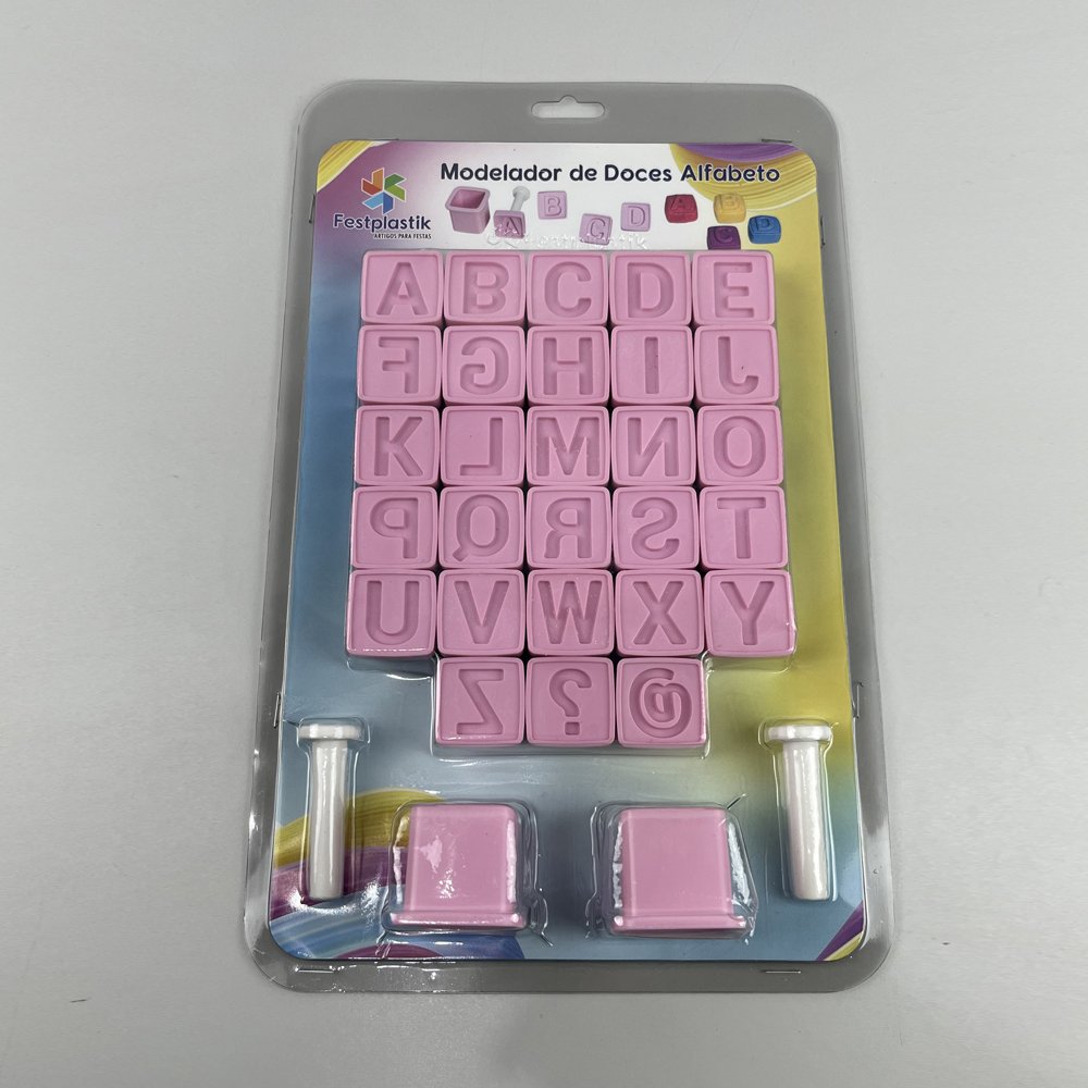 O kit ALFABETO contém 32 peças sendo: 26 letras, 1 arroba, 1 interrogação, 2 cabos e 2 marcadores.