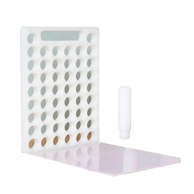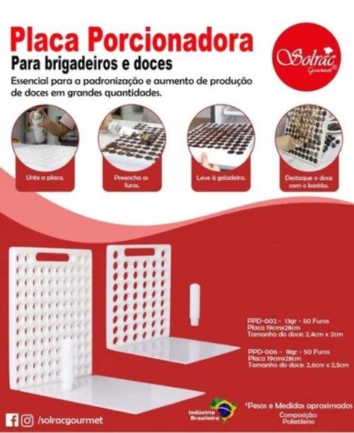 Tamanho da placa dosadora: 19cm x 28cm x 2,5cm – 50 furos (50 doces)