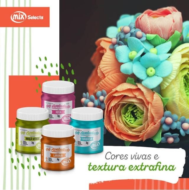 Pó decorativo aveludado fosco para pintura em superfícies. Proporciona acabamento fosco com aspecto aveludado. Utilize aplicando uma fina camada em pasta americana, massa de flores, pastilhagem, glacê real, etc...